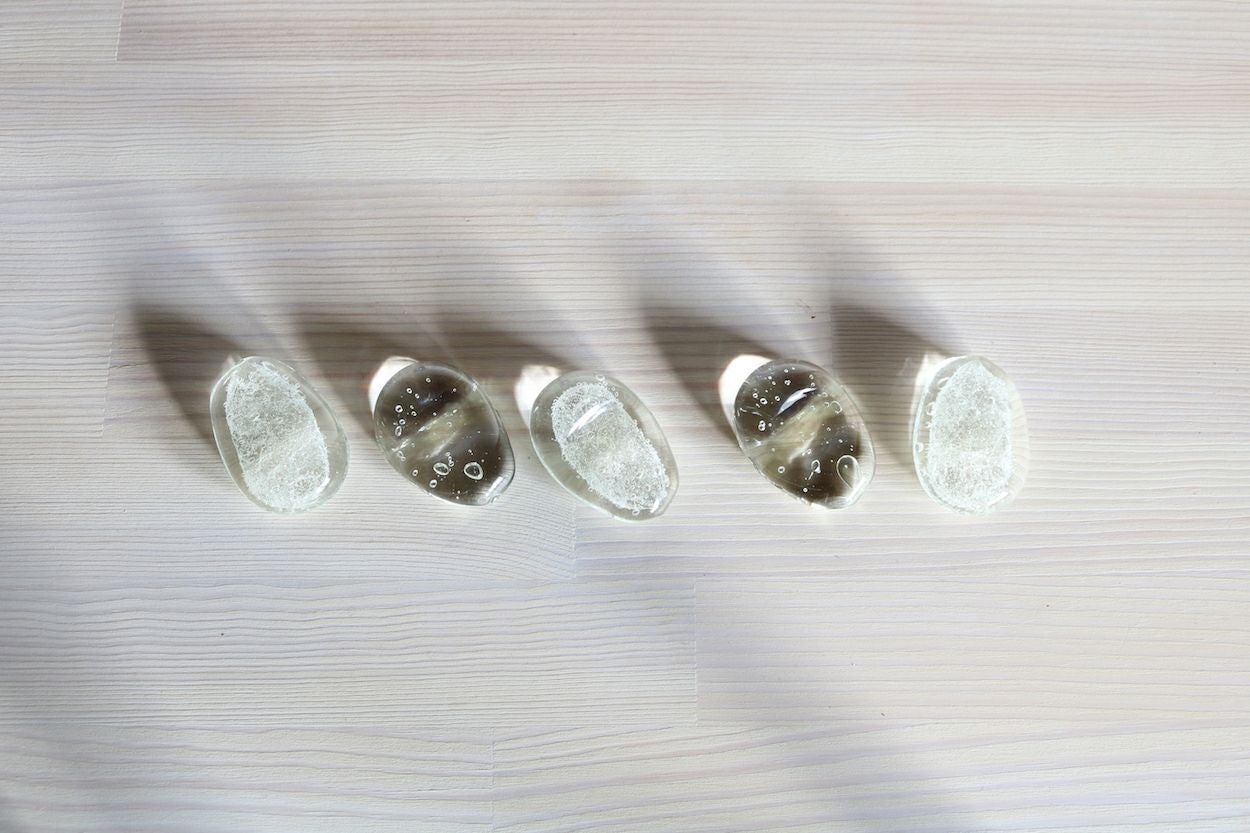 - 宙吹きガラスの技法で小さい工房で1 つ1つ手作りしています。泡の入り方、線の太さ、間隔など全く同じものはできません。サイズ表記も5mm~1cm 程の個体差がありますのでご了承下さい。